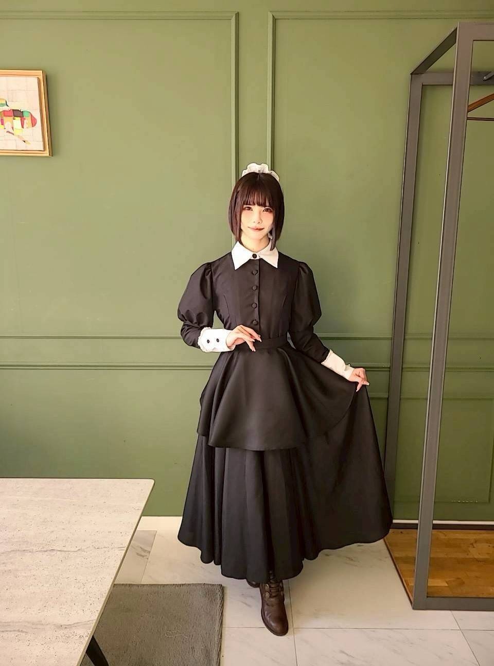 「低身長の方が最もかわいく見えるロングスカートのメイド服を作ります!ミモレ丈のスカート、動きやすい短め袖で炊事も楽々♪華美ではないさりげないかわいさのメイド服です!」