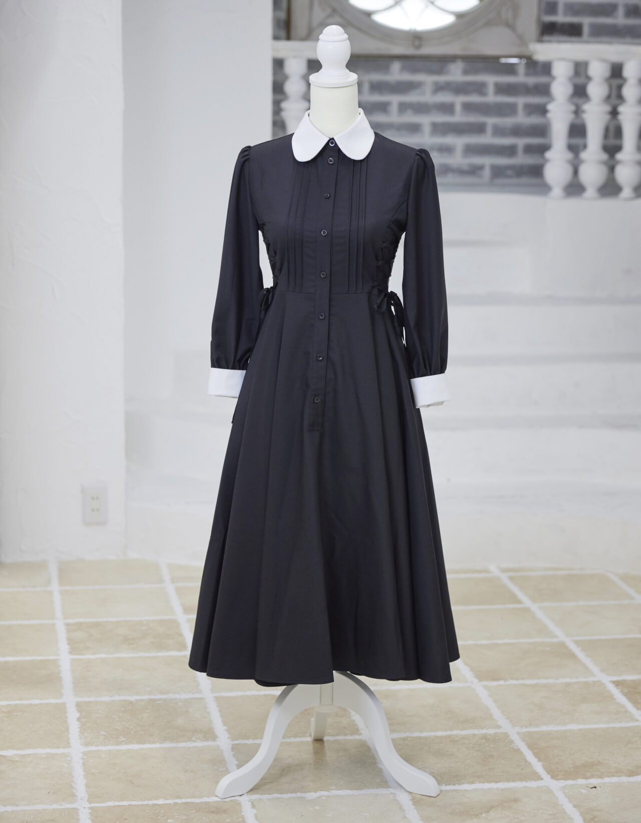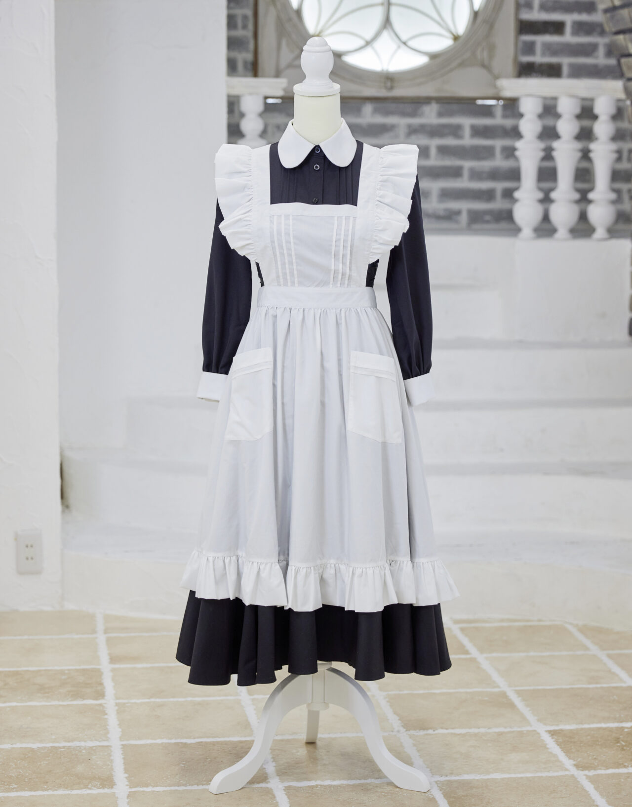 ワンピース、エプロンともにタックが入っていてかわいらしい作りになっています。